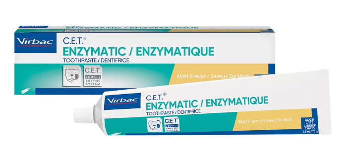 When it comes to toothpaste, we recommend the C.E.T Enzymatic Toothpaste. Many dogs and cats love the poultry flavor, which can make brushing time easier and more enjoyable for everyone involved.