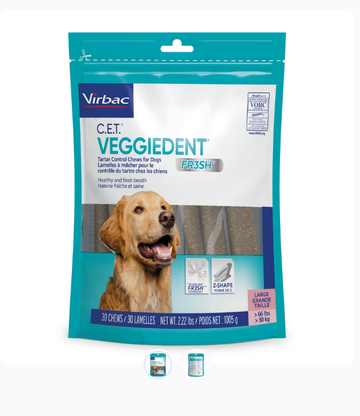 Fun Fact: a good rule of thumb when choosing dental products for your pet is to look for the Veterinary Oral Health Council (VOHC) Seal of Acceptance. Products with this seal have been scientifically tested and proven to help reduce plaque and/or tartar, which can lower the risk and severity of periodontal disease. To learn more about the VOHC and approved products, visit vohc.org.